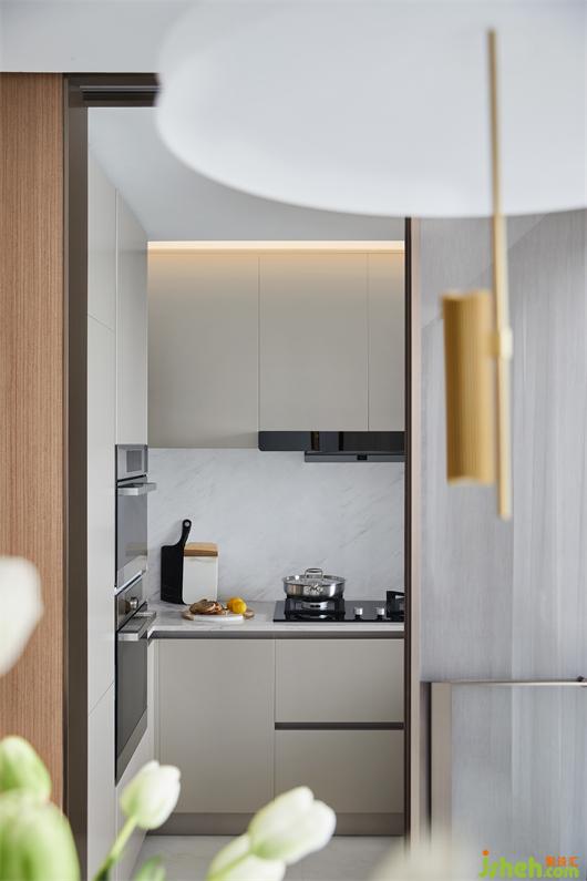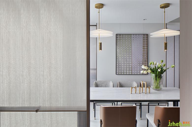 流動(dòng)的美感與酣暢的呼吸在餐廳處得以充分體現(xiàn),作為中樞所在,它被客廳、廚房與書(shū)房自由地圍繞,彼此功能完整之余,還保證互動(dòng)交流性,切實(shí)關(guān)照居住體驗(yàn)。