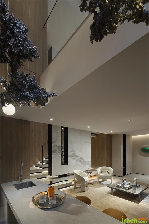 在珠海樣板房設(shè)計(jì)中不斷探索和審視居者與周圍事物、景色的關(guān)聯(lián),于是拆除一面墻體,讓大片落地玻璃將庭院景觀引入,揮桿之際,都市品格與自然情致渾然合一。