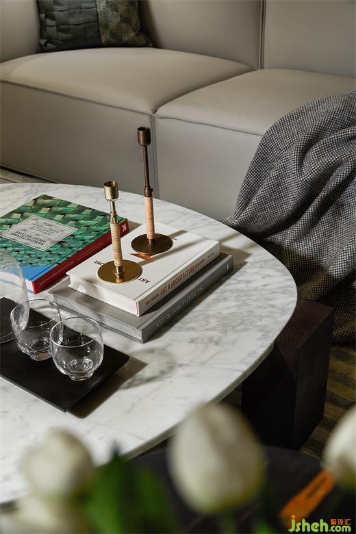 尺度闊綽從容,動線優(yōu)雅流暢,愜意之感自客廳撲面而來。電視背景墻以木飾面和皮革做拼接,層次感十足,軟裝陳設亦強調功用,南京樣板間設計拒絕過多裝飾,加以色彩、肌理的呼應,干練利落,也呈現(xiàn)出理性的輕奢調性和高雅的審美體驗。