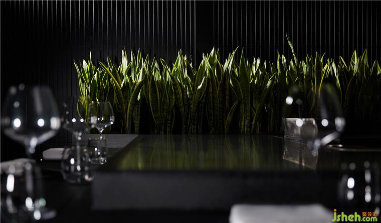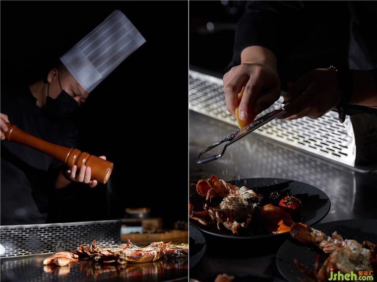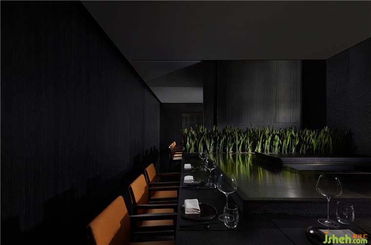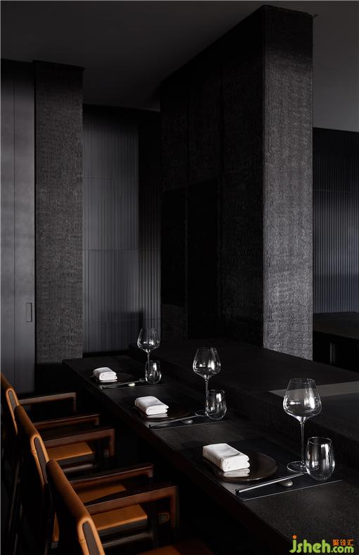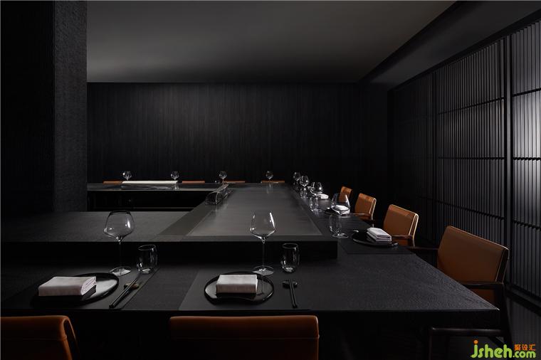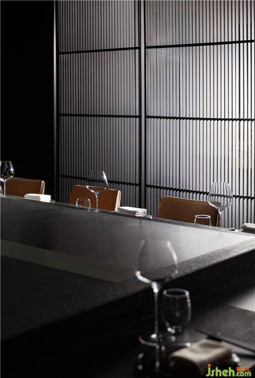 整個(gè)就餐區(qū)色調(diào)統(tǒng)一,間或些許跳色,木質(zhì)、石材、金屬、皮革等相互碰撞,近可感受肌理質(zhì)感,遠(yuǎn)能一覽結(jié)構(gòu)輪廓,鐵板燒餐廳設(shè)計(jì)在光線和視角的轉(zhuǎn)換之下,意味深長(zhǎng)。