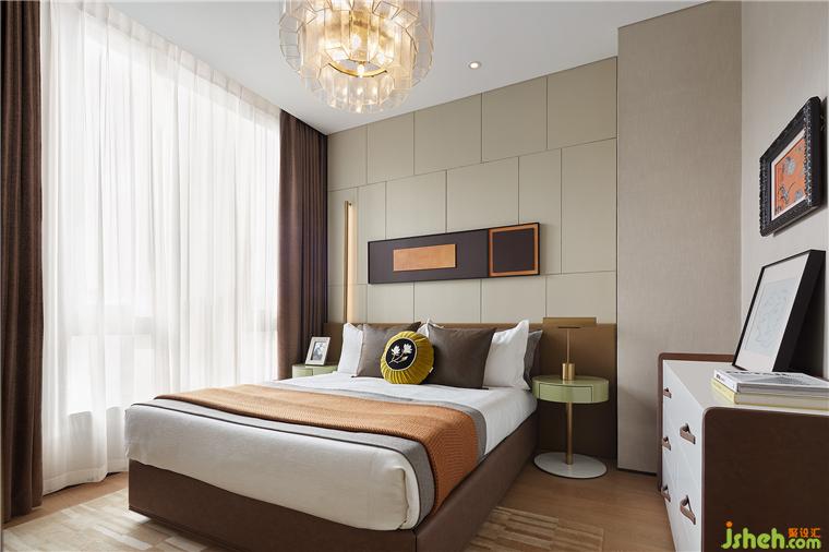 次臥以漸進(jìn)式的筆觸展開,床頭背景墻以體塊的劃分與拼接勾勒著起伏之韻,陳設(shè)布置則顯得輕松隨性,樣板間設(shè)計(jì)在多元材質(zhì)的交錯(cuò)層疊中詮釋新的平衡美學(xué)。
