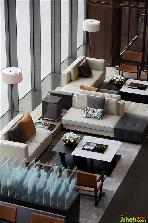 高挑空前廳內(nèi)的定制金屬屏風(fēng)、木百葉與石材悄然間流露著東方意蘊(yùn),明朗且舒緩。售樓處設(shè)計(jì)吊燈則以圓形、線性、陣列式的重復(fù)元素強(qiáng)化儀式感,剛?cè)峒鏉?jì),一派包容之意,氣度非凡。