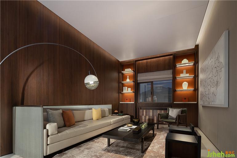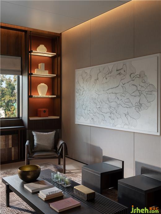 參照酒店式起居場景,于二樓構(gòu)造樞紐之地,套間居室環(huán)繞。常州天安別墅設(shè)計提取頗具東方意象的屏風形態(tài),對沙發(fā)呈包裹姿態(tài),并以此開啟圍合布局。內(nèi)斂規(guī)整的低調(diào)秩序亦進一步描摹酒店氣韻,透過陣列式陳設(shè)、高飽和色點綴,強化典雅之境。在深淺對比、錯落有致中,儀式感與隨性氣息兼具。