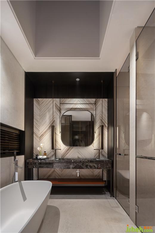 主衛(wèi)頂部設(shè)有天窗,借助光線變化塑造著微妙動(dòng)態(tài),并讓這一隅實(shí)現(xiàn)室內(nèi)外的交融與對(duì)話。此外,鏡面的尺度、位置、造型,乃至圓弧的邊角處理,無(wú)一不凝聚著設(shè)計(jì)師對(duì)功能與美學(xué)的融匯捕捉。