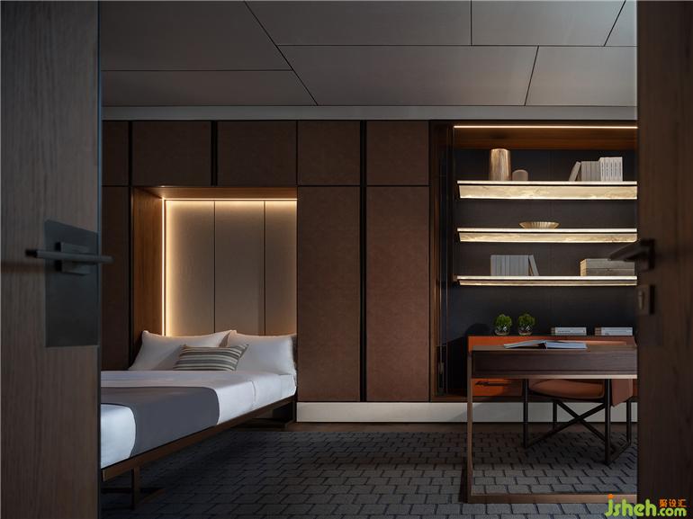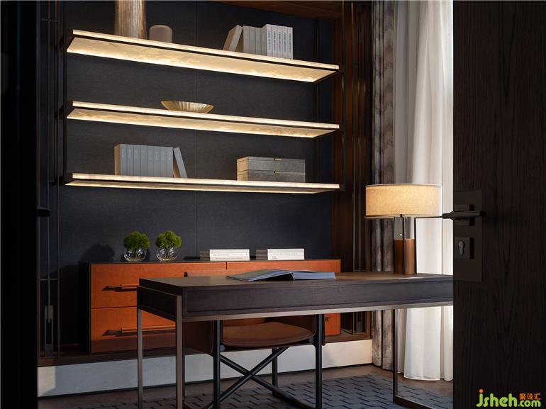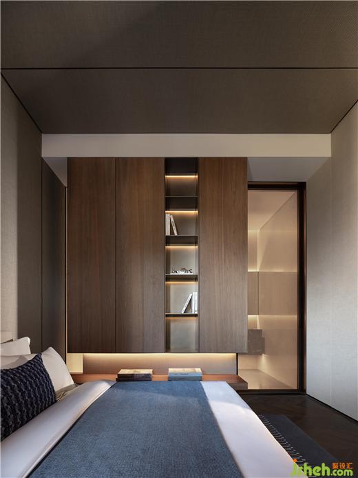 晚輩房套間以色調(diào)為觸點(diǎn)氤氳開(kāi)靜謐安適氣息,又引入紋路、肌理的細(xì)膩呼應(yīng),常州天安別墅設(shè)計(jì)傳遞出克制的高級(jí)。懸浮柜體輔以內(nèi)嵌格架,并配與燈光烘托,豐富場(chǎng)景層級(jí)。