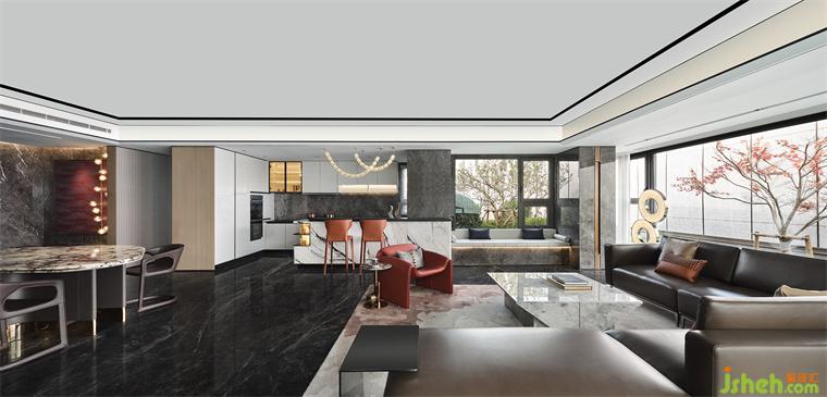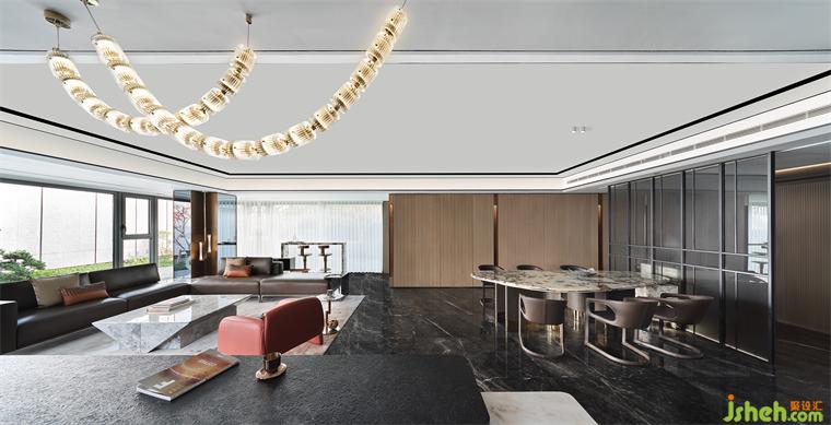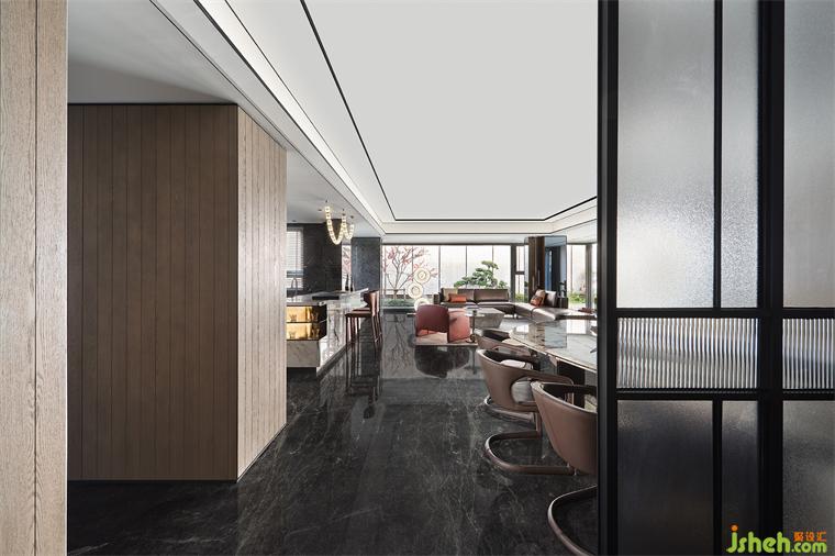 領(lǐng)先的LDKB一體化設(shè)計,將客、餐、廚、陽臺納入開放格局,樣板間設(shè)計合力打造出這頗為重要的“家庭會客中心”。于此融匯多種功能及場景,讓家不僅僅是生活的場所,也是社交陪伴的全能聚場。深灰石材與溫潤木飾的搭配,盡釋沉穩(wěn)高雅風(fēng)尚。