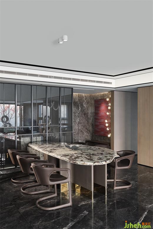 餐廳處的設(shè)計同樣利落從簡,一方石臺恰當(dāng)?shù)慕?gòu)起與餐桌的起伏關(guān)系,在不斷延展的觸角之下,解碼更加立體多維的體驗,日常生活的閑適雅趣也于此盡情釋放。