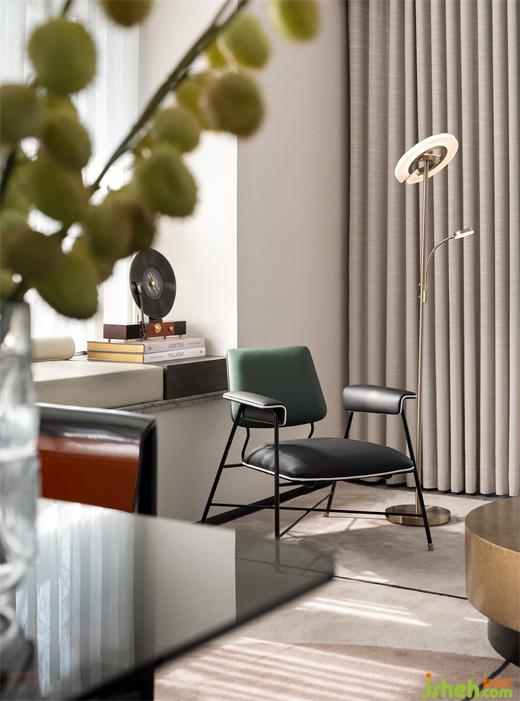 偌大的飄窗以及陽臺玻璃移門,為開放式客餐廳帶來卓越的采光面??蛷d踐行著“去電視背景化”的設(shè)計理念,上海樣板間設(shè)計讓窗外的美好景致悄然滋養(yǎng)著日常。多款家具選型上,體量感與框架感相得益彰。并因地制宜巧借飄窗角落,精心構(gòu)筑休閑一隅。