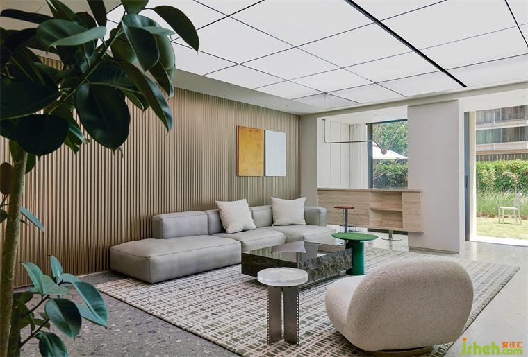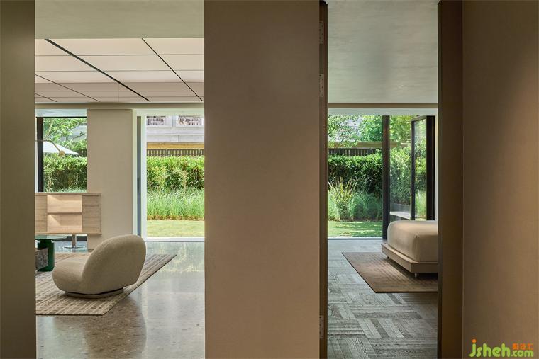 落地門窗的引入,有效實現(xiàn)南向朝陽面的采光最大化,也讓室內(nèi)與庭院無縫銜接。此外頂部燈膜營造的人造光源,進一步提升了光照效果。動線的流暢規(guī)劃與精妙串聯(lián),讓廚房和餐廳區(qū)域同樣可以透過門洞來欣賞庭院風景。