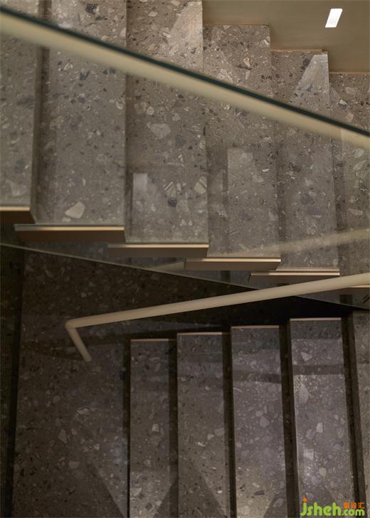 樓梯貫穿上下兩層,設(shè)計師以造型、材質(zhì)、燈光來凸顯其穿透性與輕盈度,豪宅設(shè)計在光線和視覺上建構(gòu)起有趣的關(guān)系和耐人尋味的細(xì)節(jié)。