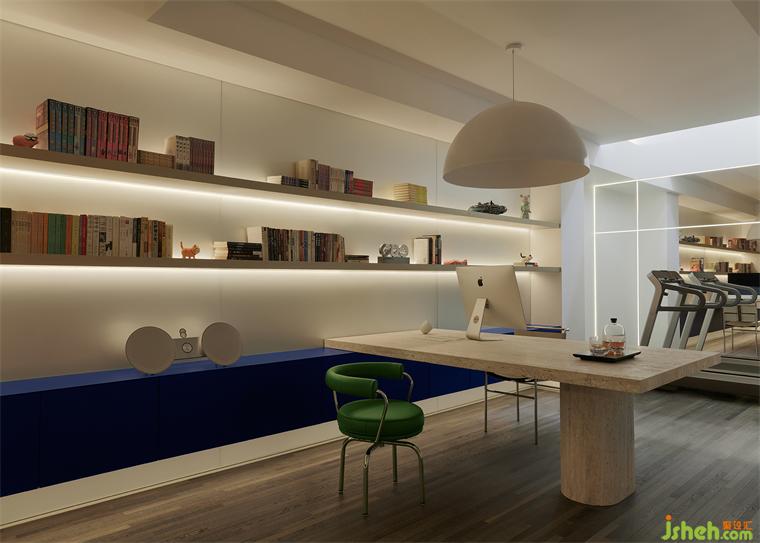 L先生還酷愛閱讀,博覽群書,書房內擺滿了各類書籍典藏,并為他閱讀或創(chuàng)作提供了安靜的場所。借助天井采光,將跑步機安放其下,酣暢運動之際,與自然也近在咫尺。此外,末端的一扇門同樣具備機動可變性,能因需實現影音室與書房的聯通或獨立。