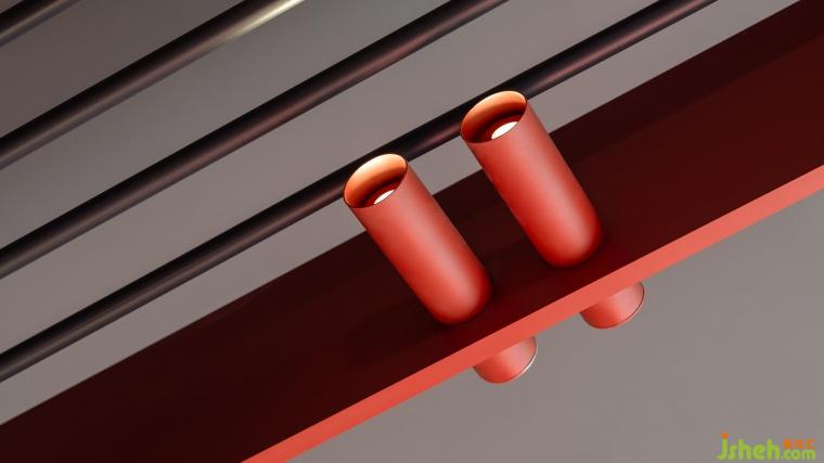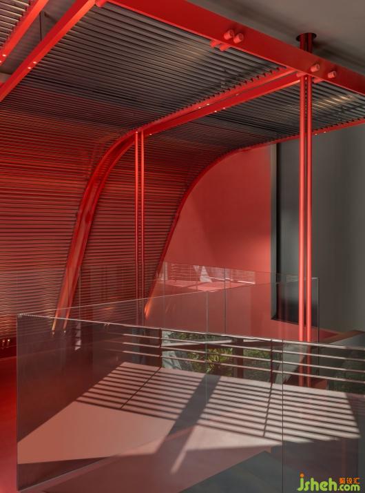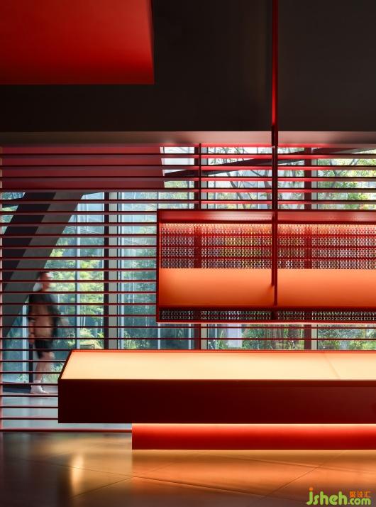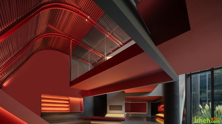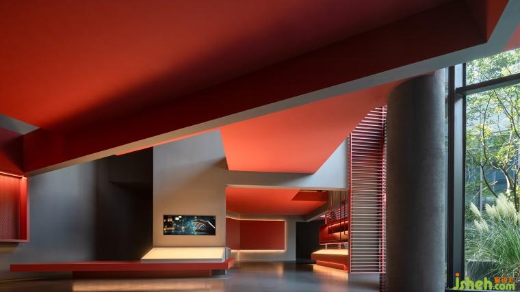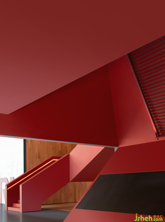 大片紅色鋪陳,在充滿溫度感的浸潤中,強化了不同物體與構(gòu)件的相互映襯。展廳設(shè)計師也注重在原有體量內(nèi)做功能復(fù)合,展臺格架既是展陳的主要載體,又是裝飾的組成部分。從墻面延伸,且從結(jié)構(gòu)上附著,在立體的交織中注入豐沛想象與蓬勃活力。
