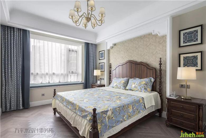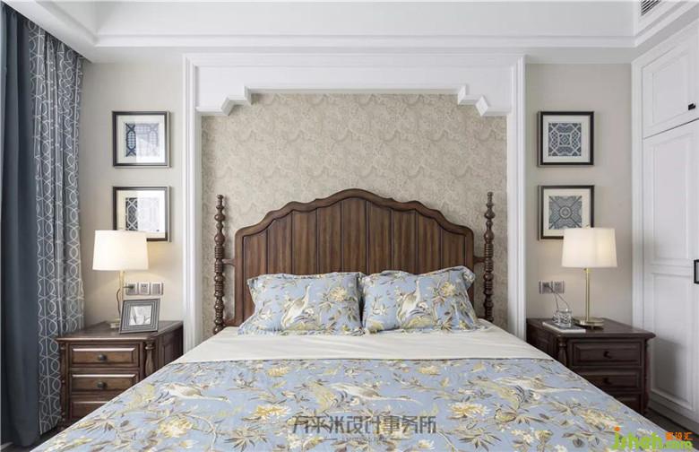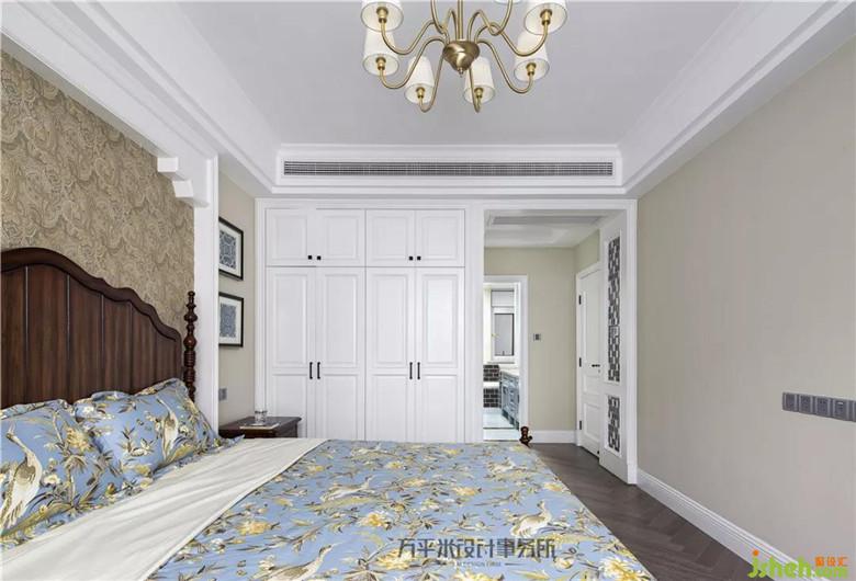 主臥套間寬敞明亮,床頭簡單立體造型將美式原木大床圍合,奶咖色云紋織錦圖案墻紙溫柔裝點烘托。