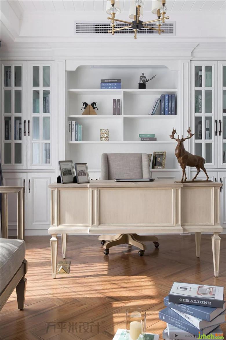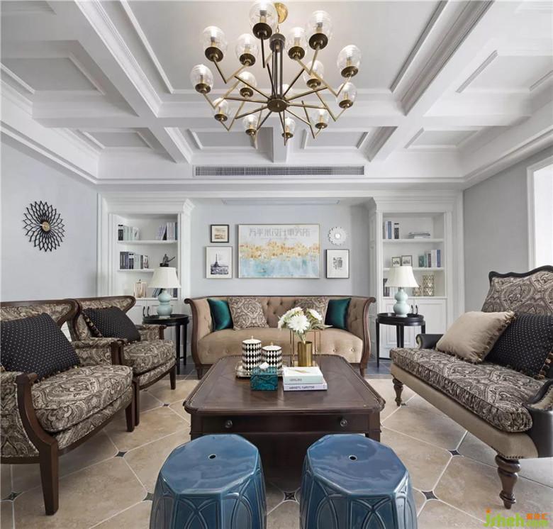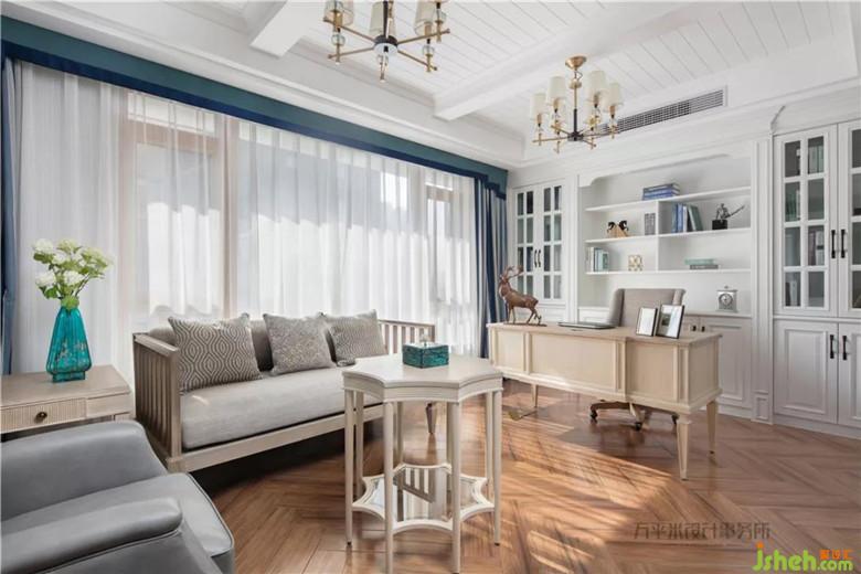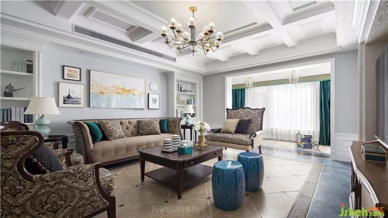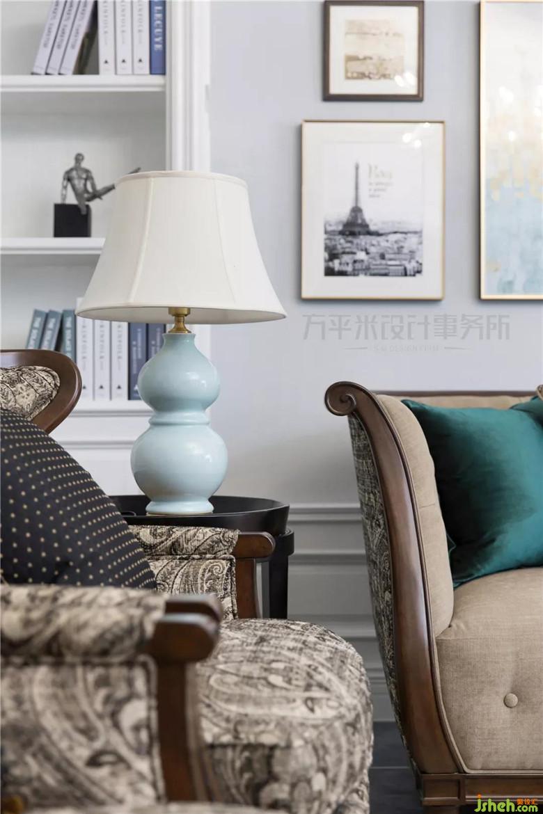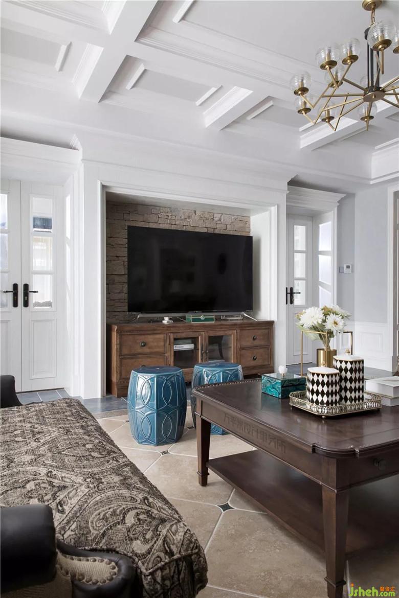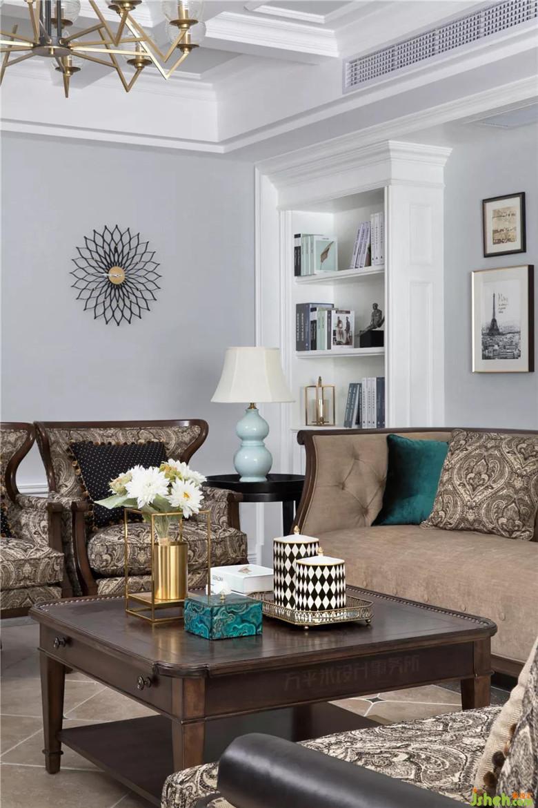 高級(jí)灰藍(lán)墻面基礎(chǔ)用色,為全屋營(yíng)造清新雅致整體氛圍;純白原木制品,紋理細(xì)膩溫潤(rùn),以精致典雅造型圍合考究比例、提亮空間;使用追求自然質(zhì)樸的粗礪天然石材及親膚棉麻布藝,給予居住者隨意放松的感受;刻意做舊的原木家具、深淺藍(lán)色系陶瓷制品與精致黃銅燈具溫柔對(duì)話;令整體空間散發(fā)現(xiàn)代美式的迷人魅力:它包容、明亮、舒適,于傳統(tǒng)典雅中散發(fā)出時(shí)尚干練的現(xiàn)代韻律之美。