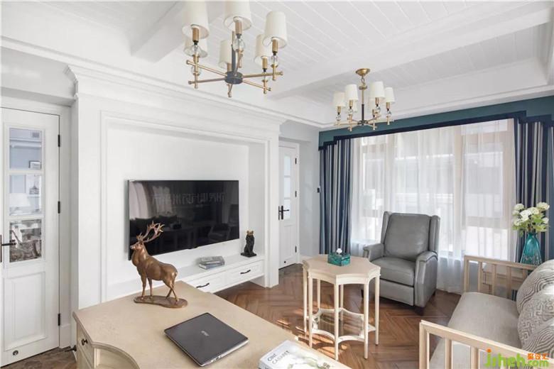 新建電視背景隔墻通過向客廳一側(cè)平移,使大尺寸電視掛壁安裝,取得舒適觀影體驗。