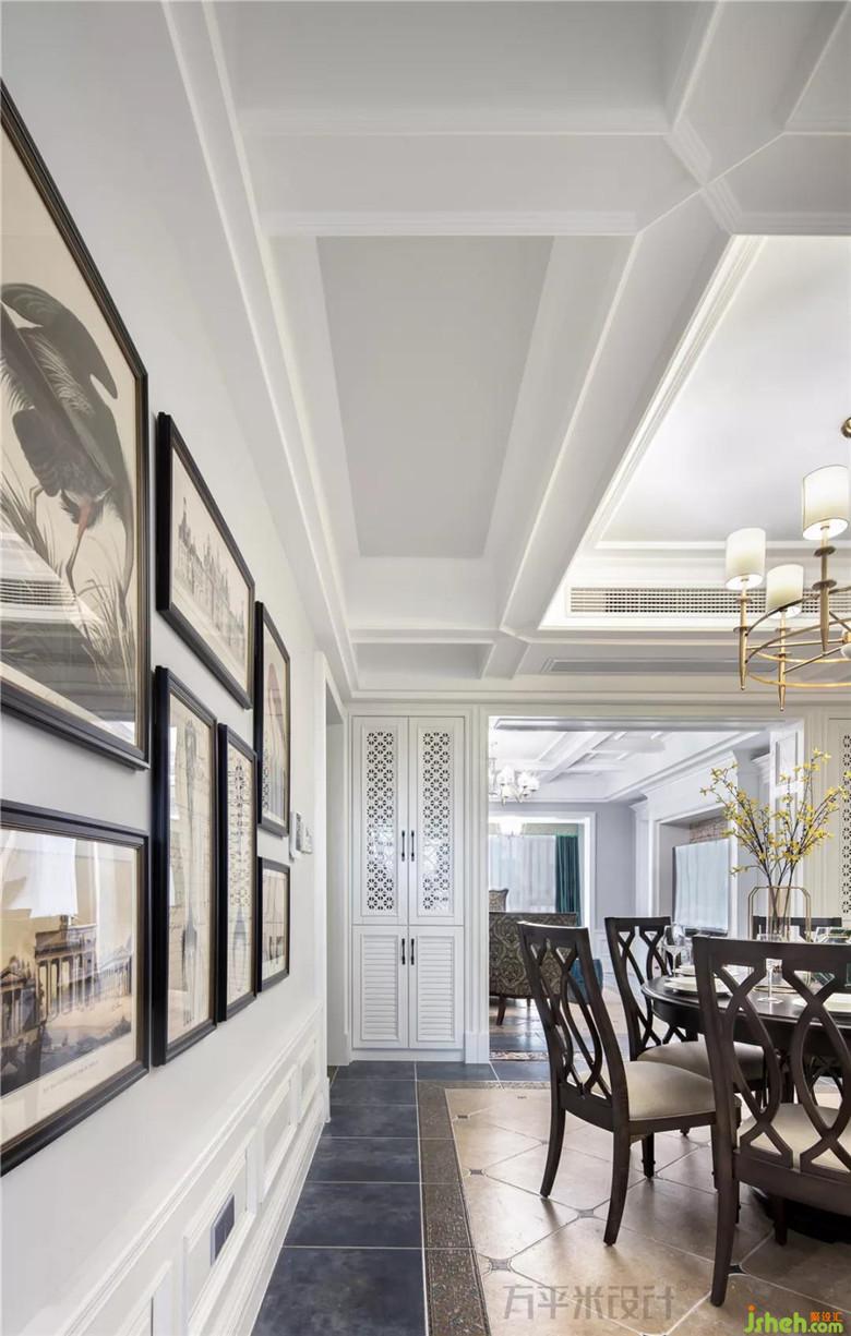 利用對稱的收納柜圍合成客餐廳之間的門洞,解決入戶玄關(guān)收納??v橫交錯的造型假梁配合局部吊頂,保留原頂凈空的基礎(chǔ)上將原有真梁及空調(diào)內(nèi)機(jī)完美隱藏。