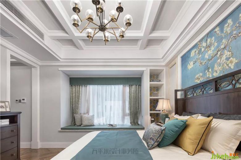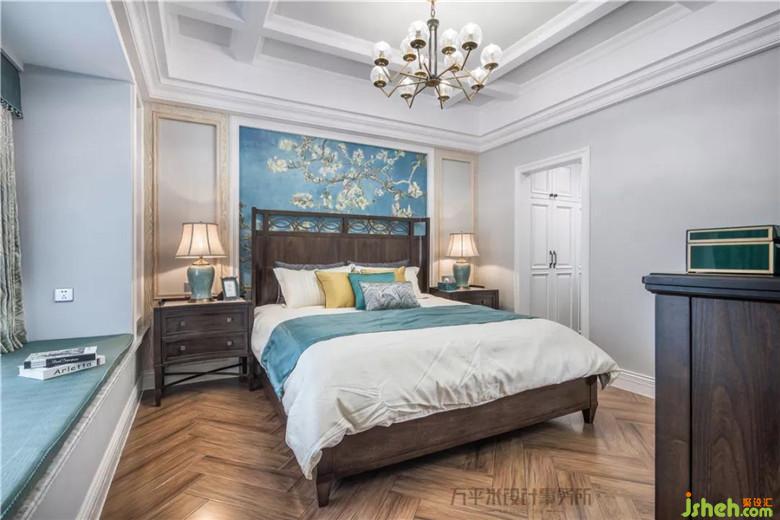 青藍(lán)色調(diào)的墻紙,窗簾,床品,裝飾畫作及臺燈擺件等色彩柔和自然過渡,品味不凡。