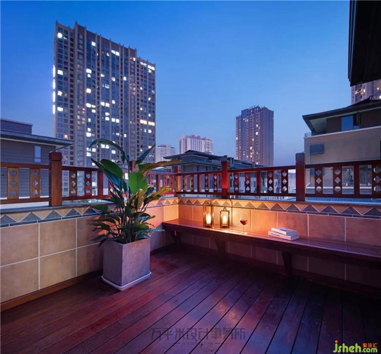 外側(cè)則使用防腐木制作地板、欄桿及一線休閑長椅。使露臺成為親近自然、休閑小憩的自在場所。華燈初上,盡享繁華都市美麗夜景。