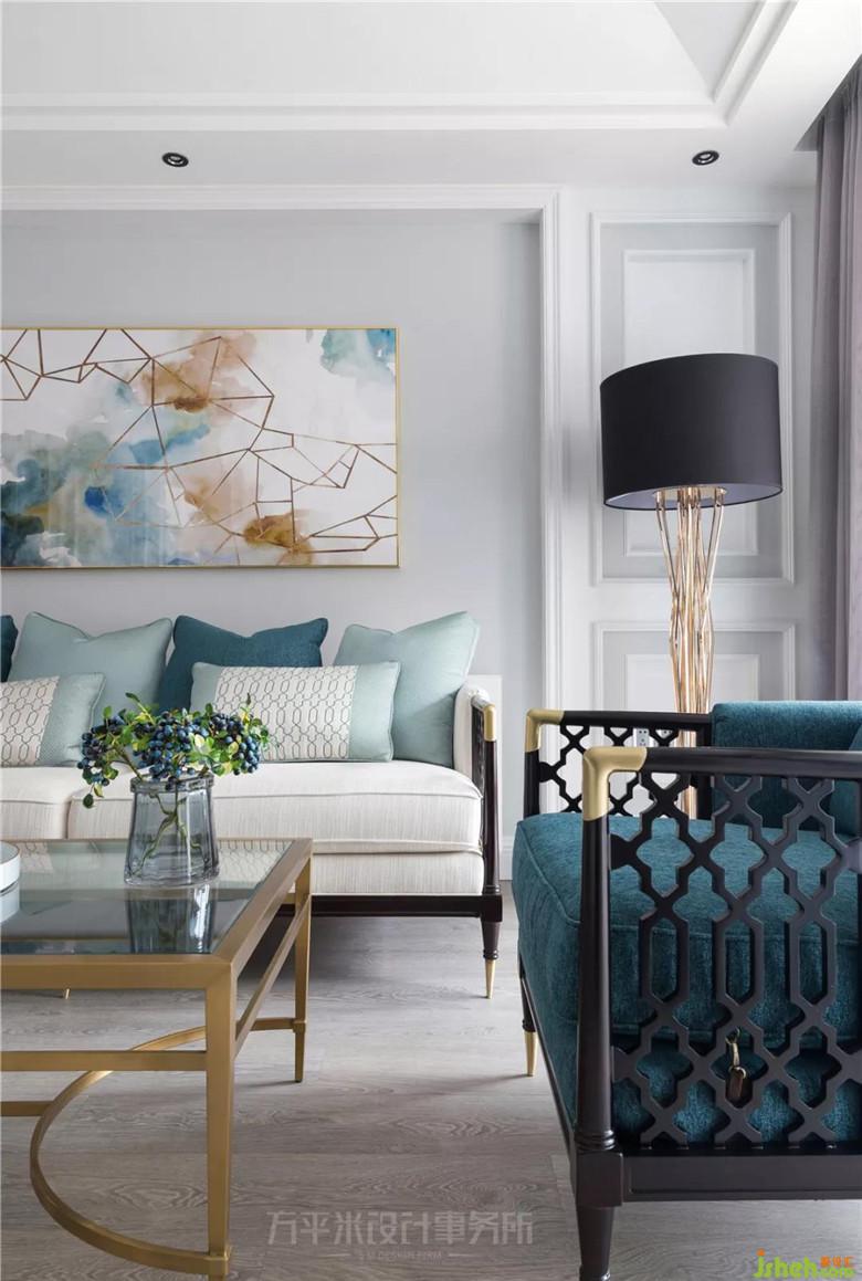 金屬圍鑲、實木雕花的布藝沙發(fā)造型優(yōu)雅、觸感柔軟,給予居住者放松舒適的觀影感受。