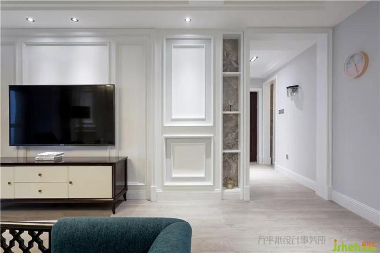 電視背景采用沙發(fā)背景相似線框幾何型分隔,在同一空間內互為呼應。