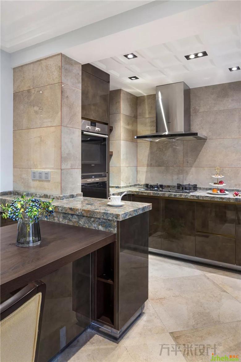 內嵌式開放展示柜為餐廳提供便利收納,采用灰紋光潔大理石為底,便于打理。