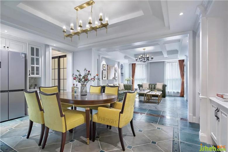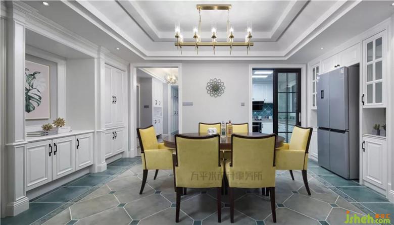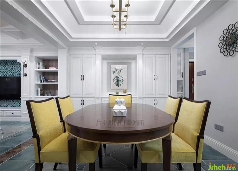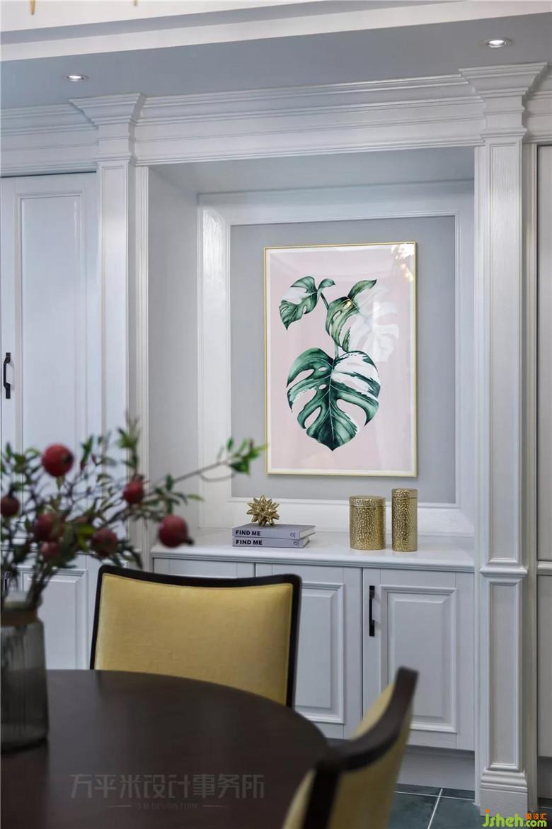 過道一側的墻面空間,依墻而設的滿墻儲物柜,考究比例分隔,以富有層次的典雅美式造型將中部留空,保留空間通透。