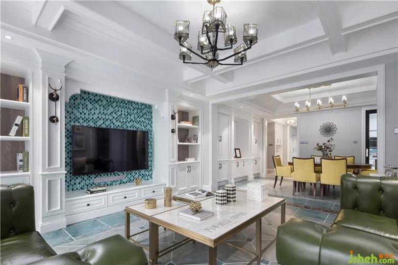 采用翠綠馬賽克及淺咖色木地板為底,仿古壁燈內嵌于兩側前端造型立柱,營造浪漫氛圍。