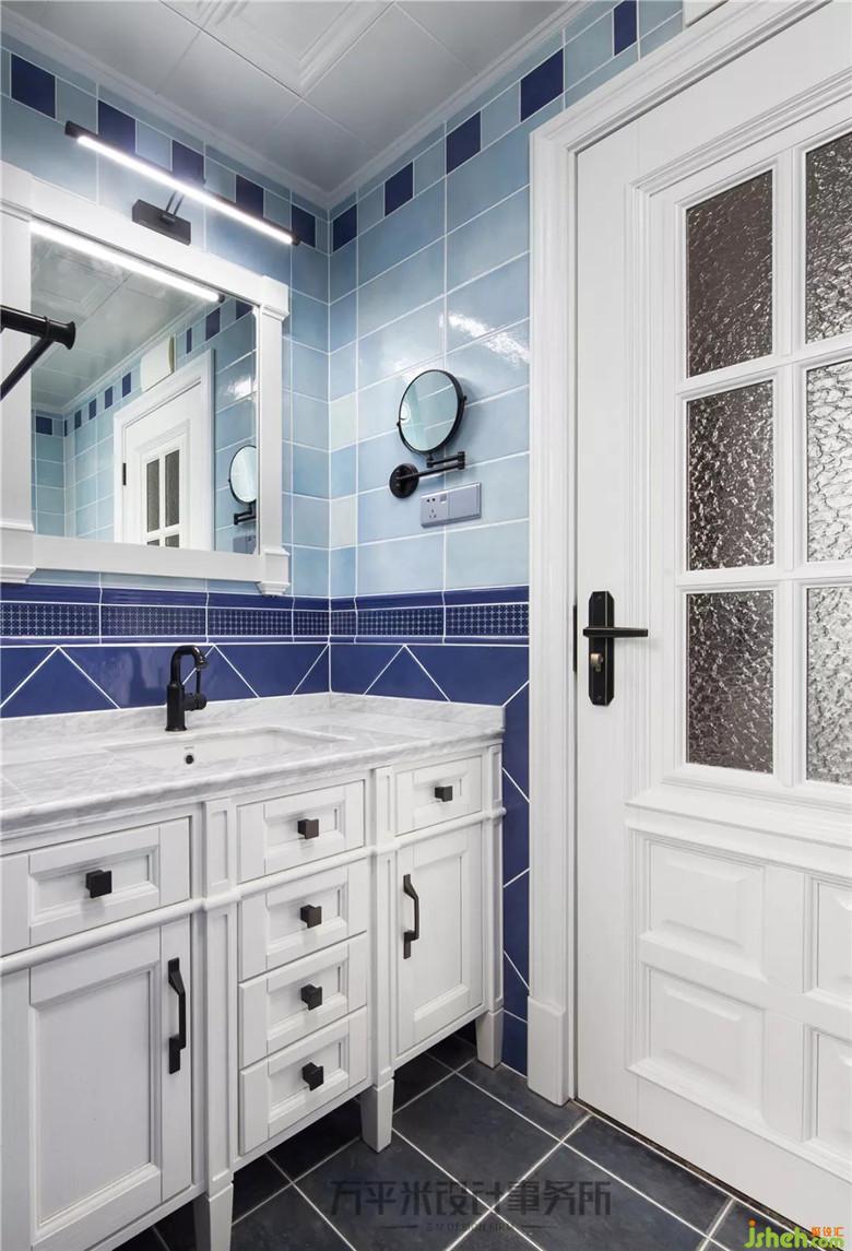 主衛(wèi)干濕分離,深淺藍(lán)色系仿古磚分色鋪貼,定制浴室嵌入式安裝。