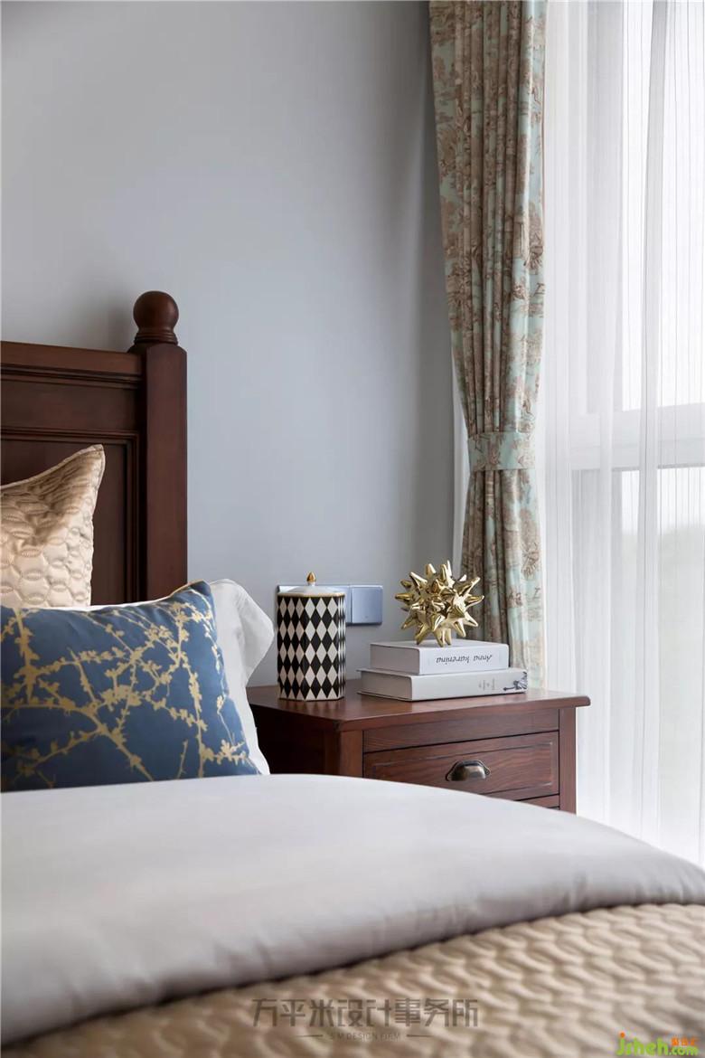 床頭背景優(yōu)雅木作造型勾勒,將美式高背大床輕巧圍鑲,并呼應(yīng)于頂面相似弧度。