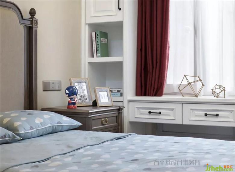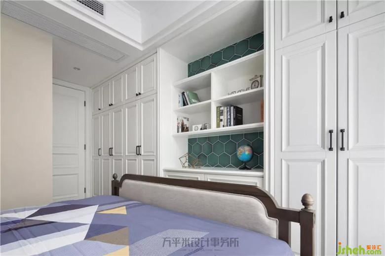 順應房型特點,于床尾一側設置滿墻儲物收納柜。