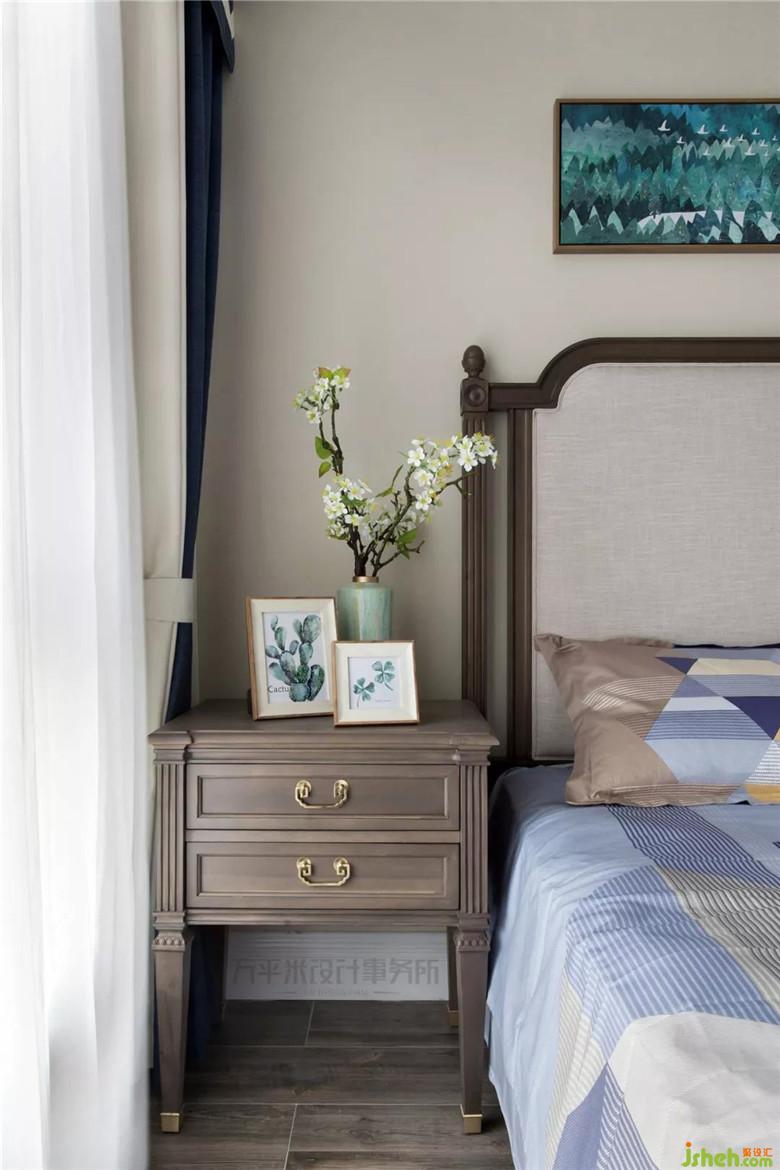 藍綠色調輕柔棉麻與灰咖原木材質,營造溫馨自然的睡眠環(huán)境。