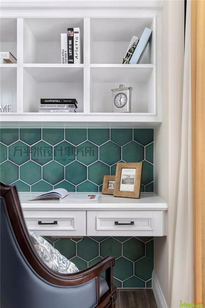 獨立書房擁有整面落地采光窗,房屋視線通透采光良好,為愜意私密閱讀空間。開放式書架及固定式書桌風格統(tǒng)一,底面采用孔雀綠手工磚,便于打理。