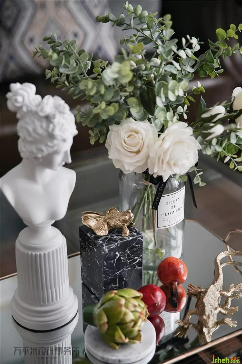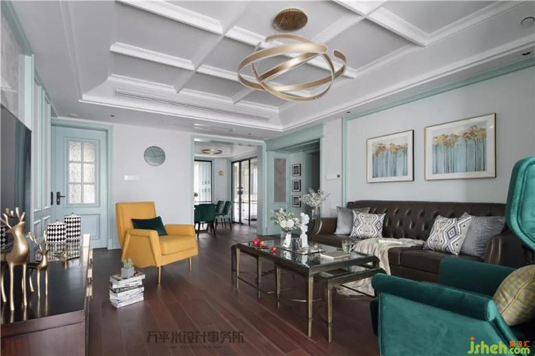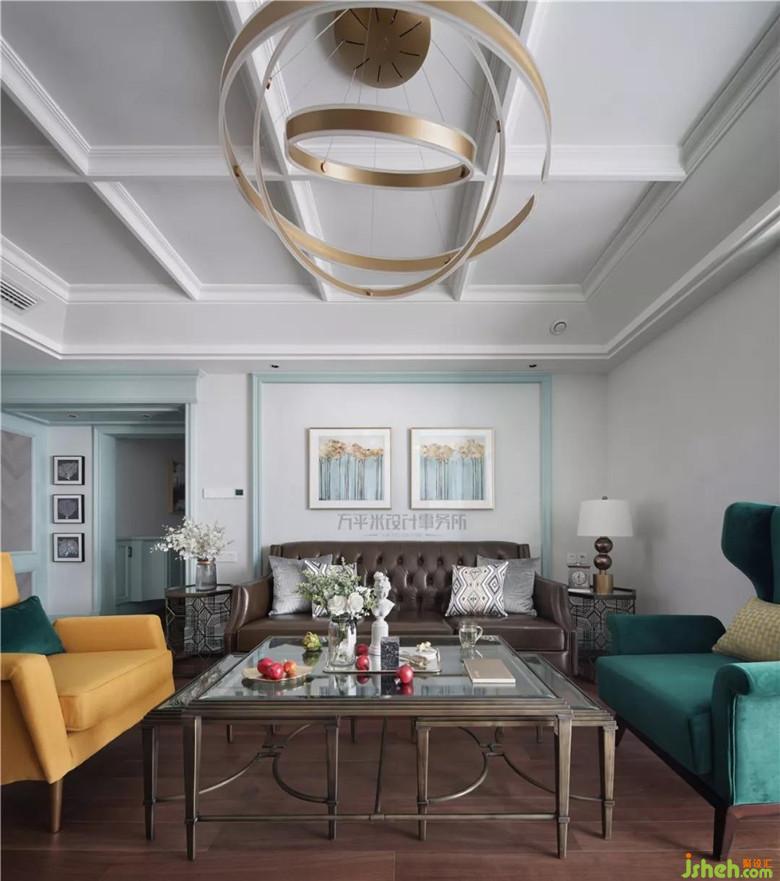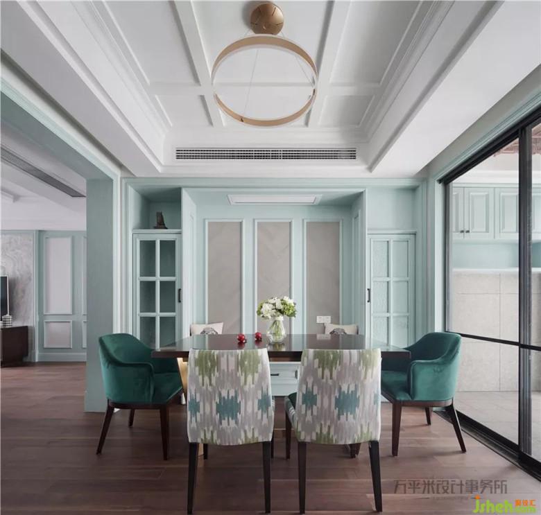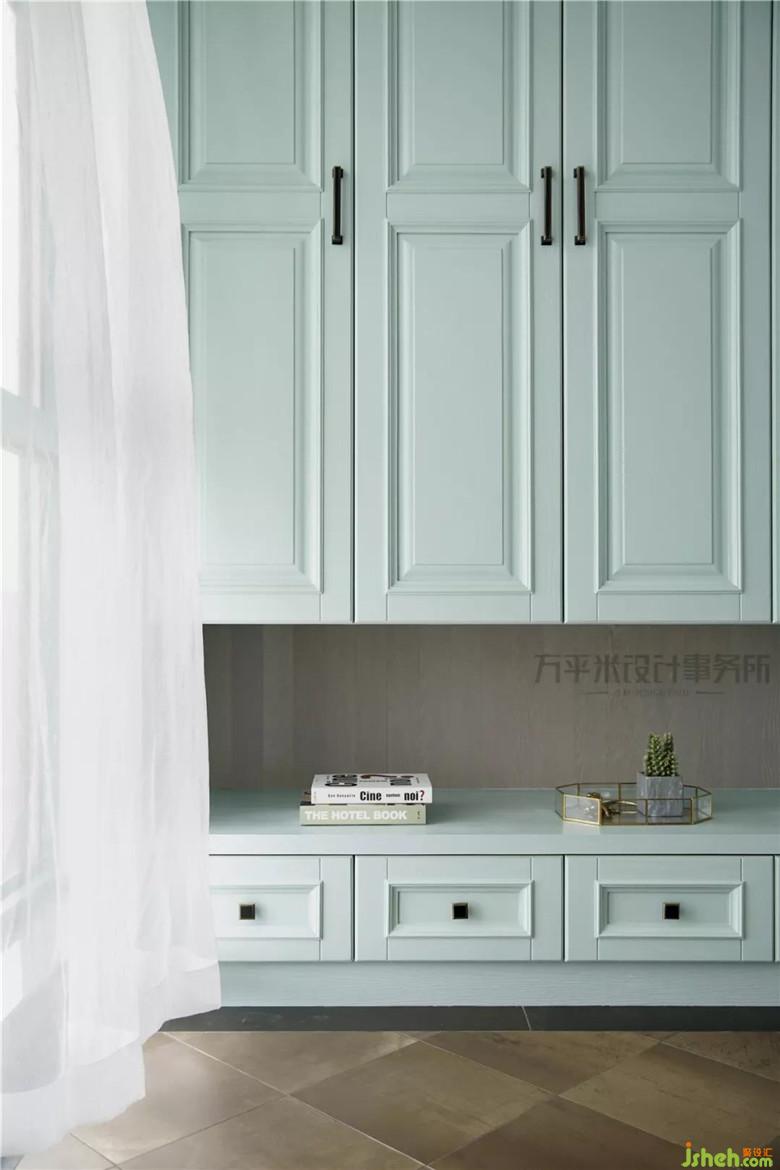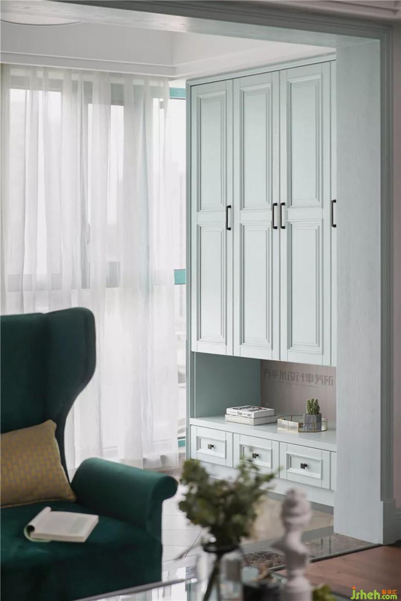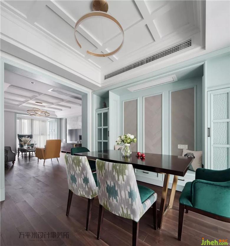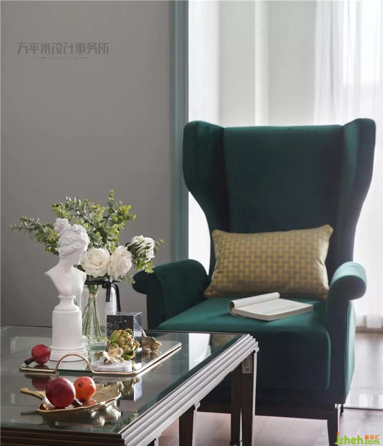 金屬質(zhì)感及獨(dú)特環(huán)狀立體照明的主燈選擇,使現(xiàn)代設(shè)計感充盈于美式傳統(tǒng)典雅。絲絨質(zhì)感的復(fù)古綠色與薄荷色調(diào)形成漸進(jìn)的色彩層次。景觀陽臺作為客廳延伸,提升全屋視線景觀及通風(fēng)采光。