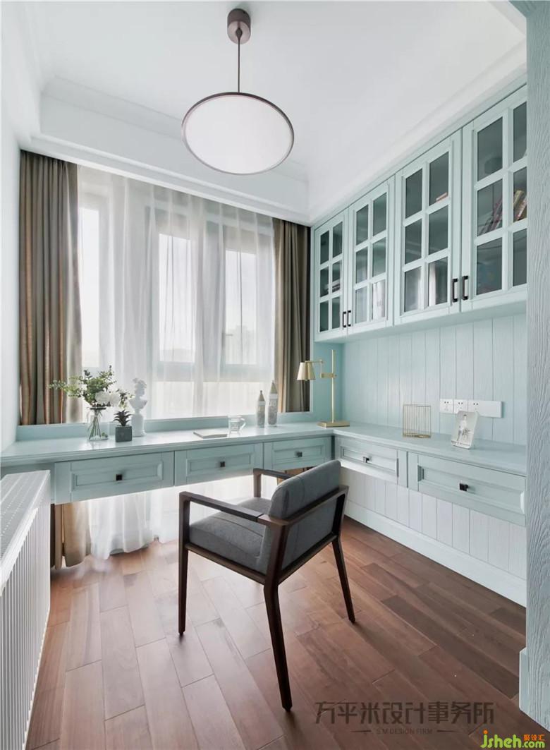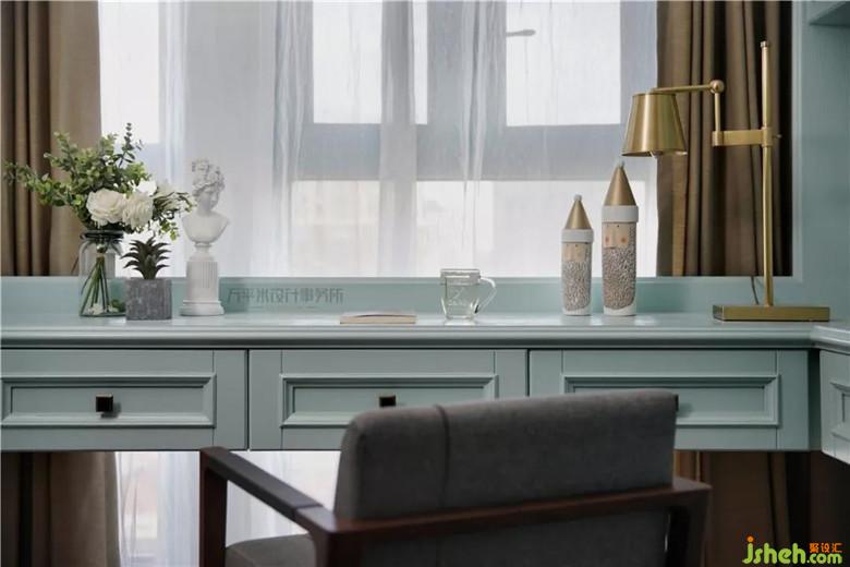 南面兒童房利用主臥原衣帽間一分為二的空間,制作內(nèi)嵌式衣柜。將原有景觀陽臺的小面積并入,成為套間內(nèi)的小書房。臨窗光線充足,現(xiàn)場制作的L型大書桌,寬敞桌面便于使用。貼心設置的小擋板防物品滾落。