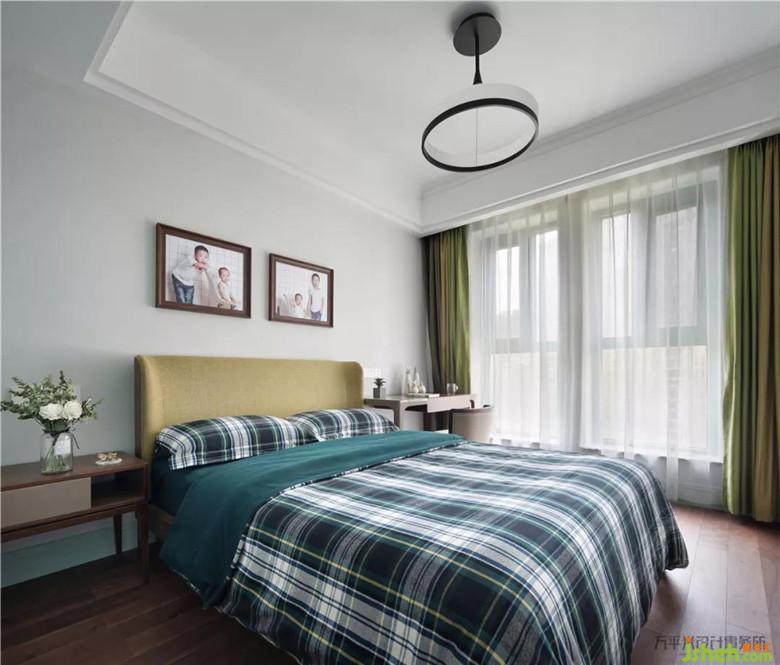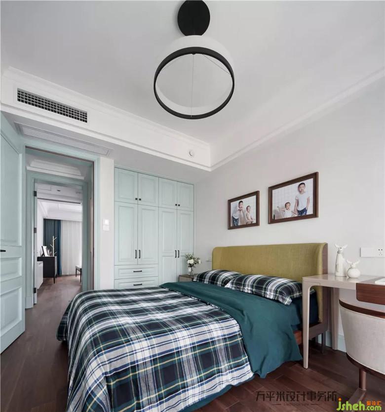 北面兒童房原始尺寸較為寬敞,于靠窗明亮放置書桌椅。窗簾與床選用相同的溫柔草綠色,互為呼應。