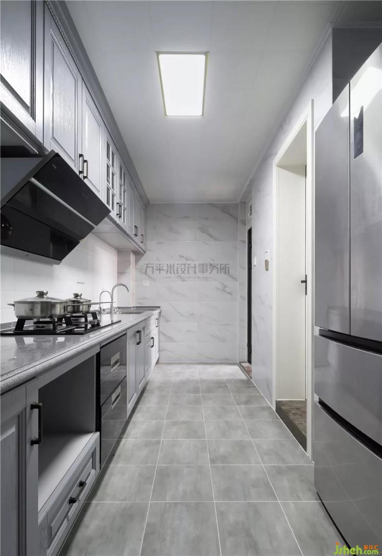 將隔墻砌出凹槽借用后方空間,使狹長廚房有了容納冰箱的合理區(qū)間。冰箱嵌入后不影響原櫥柜空間及通行動線。滿墻地柜及吊柜得以延長,提升收納功能也為洗切炒盛留出足夠操作尺寸。定制灰色櫥柜及同色臺面,搭配白色光潔小磚鋪貼。有清爽的高級感。