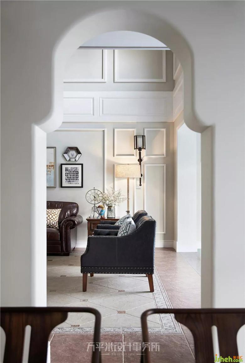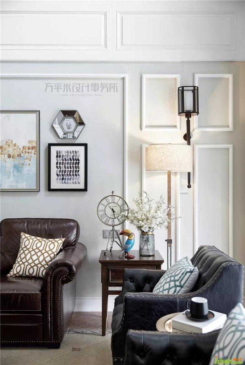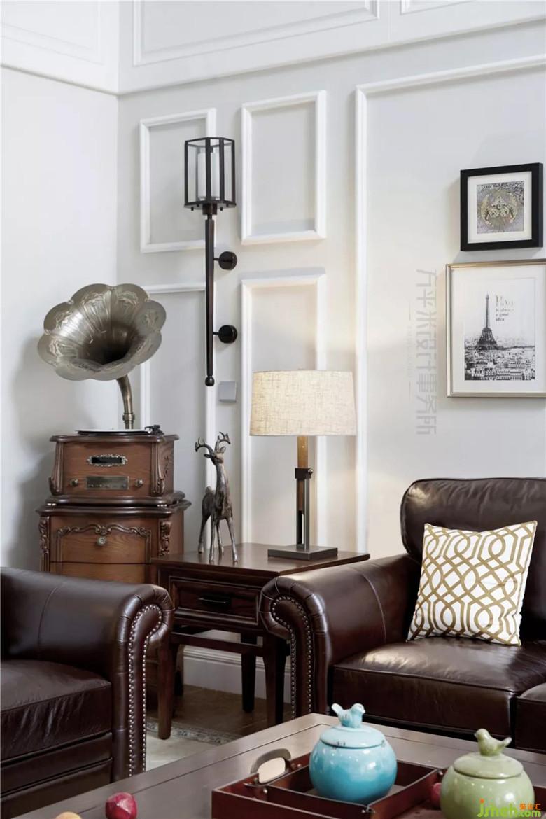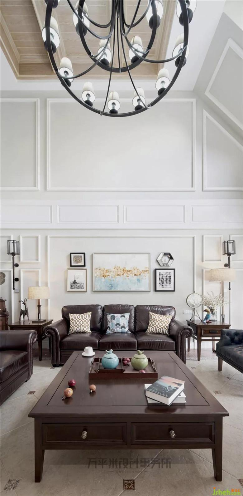 選用深色皮質(zhì)及木質(zhì)家具,利用沉穩(wěn)色彩將大空間的重心壓低。木質(zhì)護墻板環(huán)繞區(qū)分樓層位置,上層精簡線條適當留白,主次分明。鐵藝元素及復古擺件點綴。線框以考究比例分隔,豐富長距離墻面。