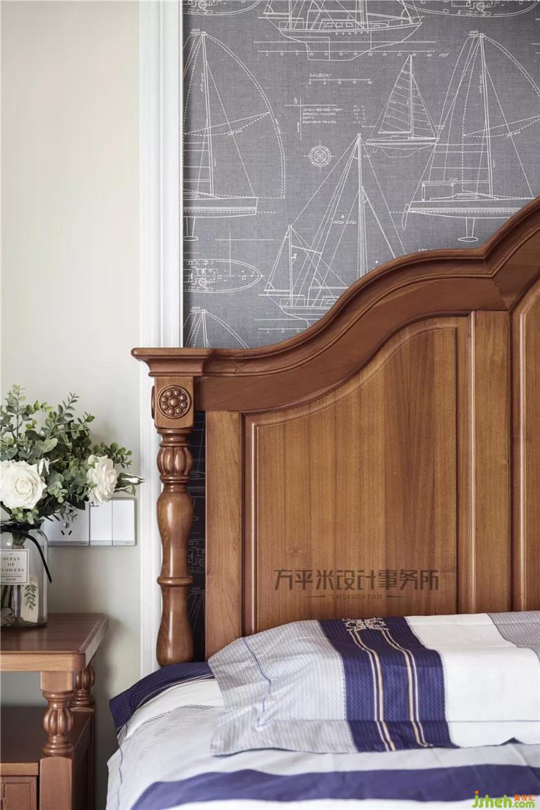 一層南側(cè)臥室為業(yè)主大兒子的房間。小露臺直接納入室內(nèi)成為外推的四面采光窗,提升整體起居光線。精選牛仔布紋帆船主題的墻紙裝飾于床頭造型,童趣十足并帶有男孩子的帥氣感。