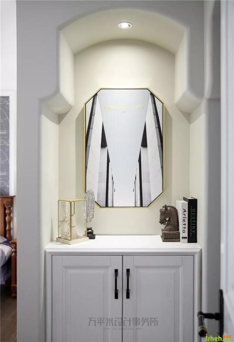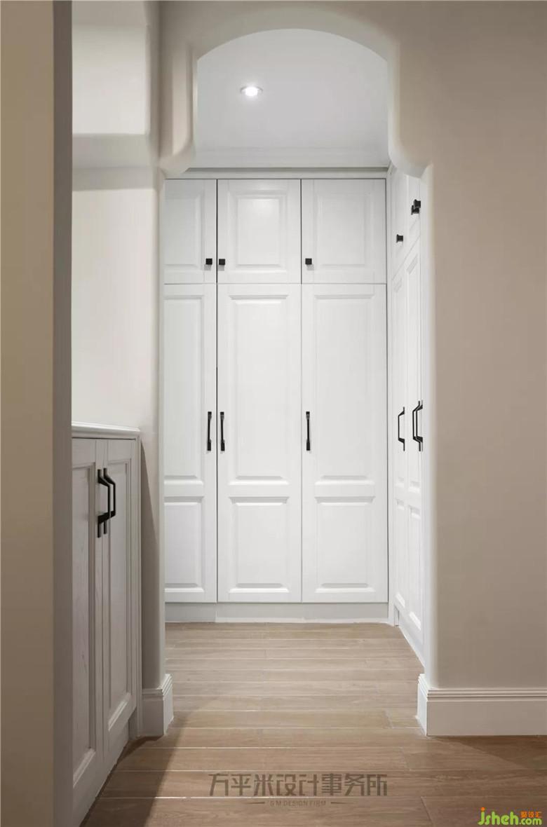 原本臥室內(nèi)狹長的通道,經(jīng)調(diào)整入口位置將空間合理利用,墻面后推少許,制作小型端景。原本的狹長過道變?yōu)長型衣帽間,為臥室提供合理收納。