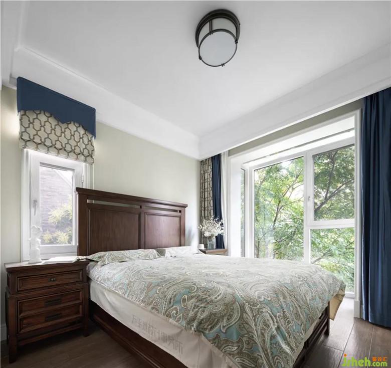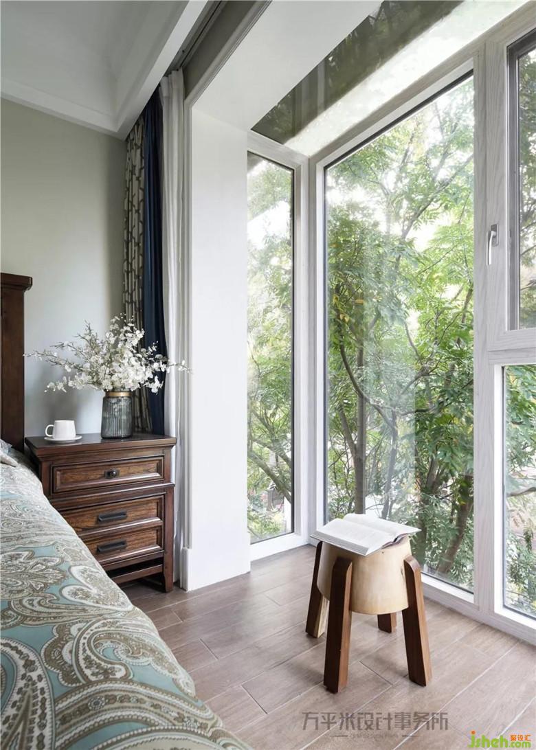 一樓次臥供長輩同住,同樣將小露臺直接并入室內(nèi),將綠植景觀直接引入室內(nèi)。深咖家具與靛藍窗簾創(chuàng)造沉穩(wěn)而平靜的睡眠環(huán)境。外推的小空間為室內(nèi)提供更為寬松的整體氛圍。