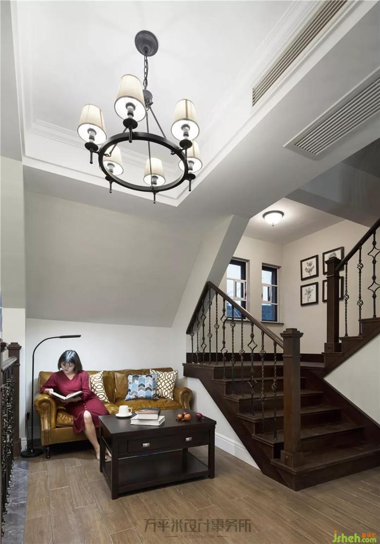 考慮斜屋頂?shù)某叽?,二樓至三樓的扶梯位置平移調(diào)整,取得更合理寬裕的步行通道。休閑沙發(fā)擺放于內(nèi)空處,臨近電視墻上部的展示書柜區(qū),方便取閱之余,成為舒適的閱讀區(qū)域。