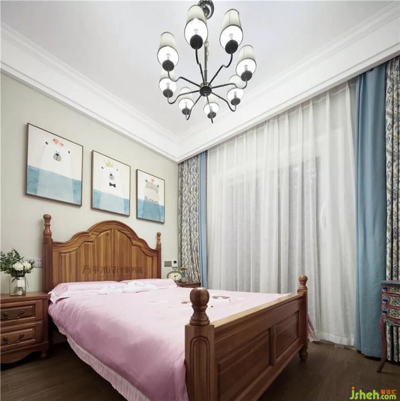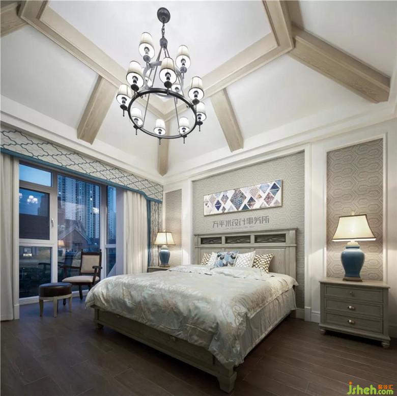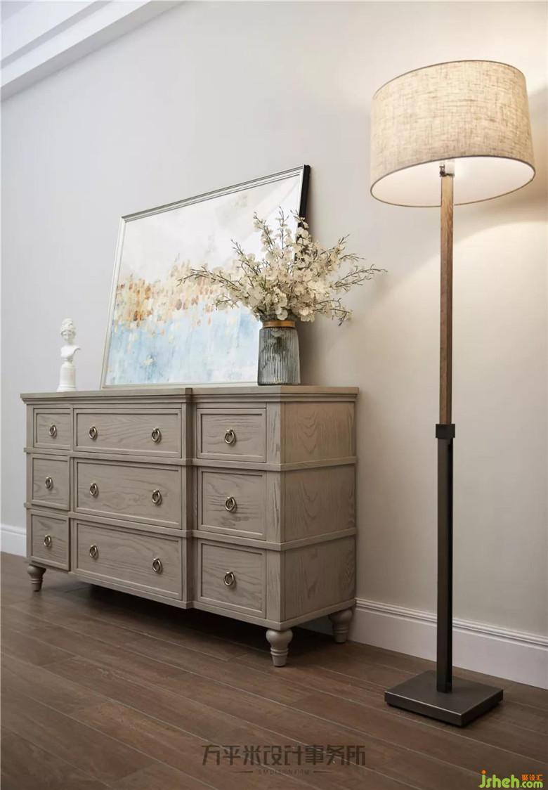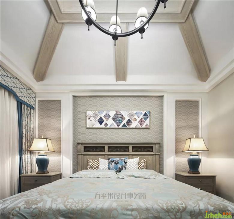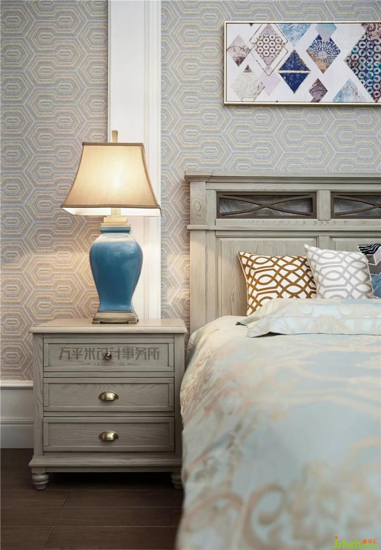 女孩房對面的獨立小書房,可作為孩子安靜的讀寫區(qū)域。主臥選用年輕感的自然灰色調(diào),更顯輕盈及品味精致。風(fēng)化白造型木梁充實于挑高的頂面?;宜{(lán)綠色墻紙及布藝以低純度的色彩柔和過渡、輕柔點綴。