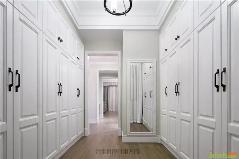 輕柔色彩及幾何圖案的使用,令整體散發(fā)出一種知性的中性美感。床尾一側(cè)擺放斗柜。主臥套間內(nèi)獨立衣帽間。