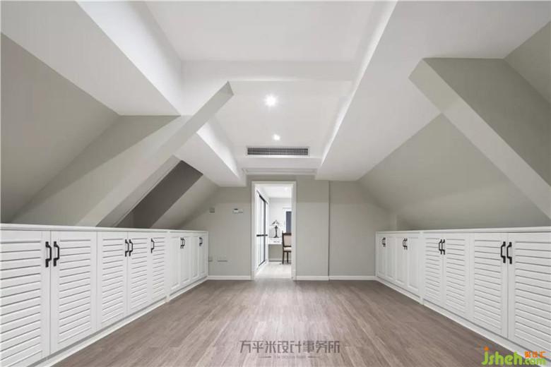 三層為原本贈送的尖屋頂挑空區(qū)域,現(xiàn)澆樓面后作為瑜伽及儲物間使用。兩側(cè)斜角位置制作對稱的地柜儲物。中間寬敞區(qū)域為瑜伽區(qū)。獨立儲物間,臨窗處設置小書桌,使得房間也可變?yōu)閹в惺釆y臺的衣帽間。