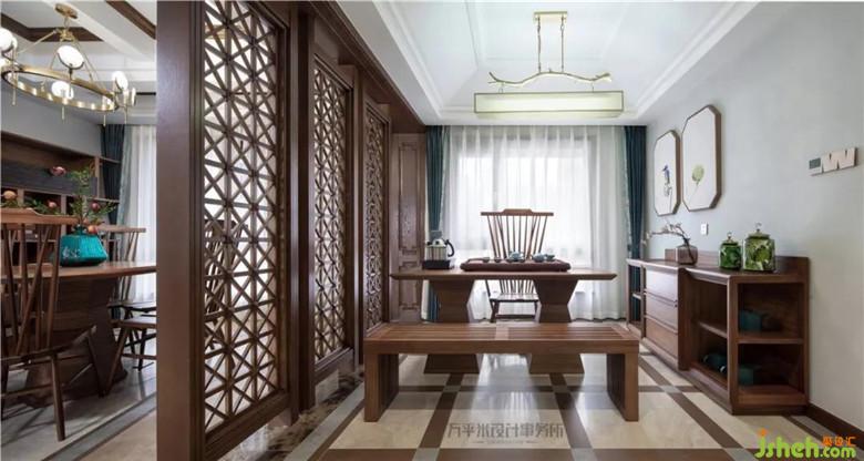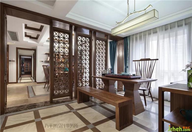 經(jīng)由門廳進入茶室,將房間原始隔墻取消,以并列的三扇屏風取代,定制的原木鏤空屏風兩側(cè)均留有通道,環(huán)形動線出入無拘。