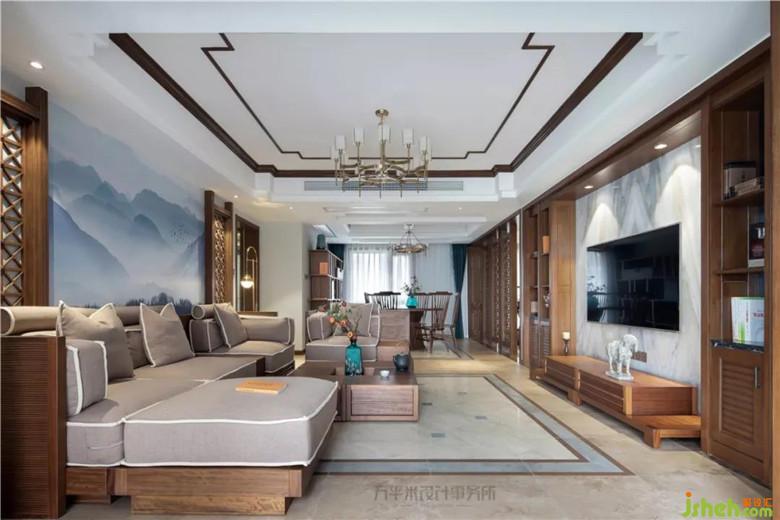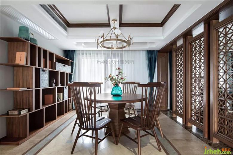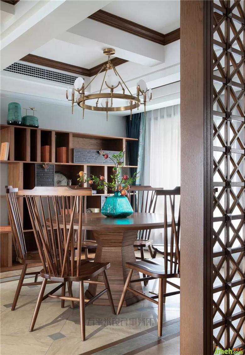 因隔墻拆除,屏風位置后移調(diào)整,令餐廳縱向空間變大,可輕松容納餐邊柜尺寸;利用地磚拼花位置,從視覺上橫向借用過道面積,并通過對應(yīng)頂面對稱地面調(diào)整,平衡空間。木質(zhì)竹節(jié)雕花柜門與淡青竹葉隱花窗簾相得益彰,取青翠沉靜色彩平衡大量木質(zhì)暖色調(diào),取竹之君子品德寓意高雅堅韌。