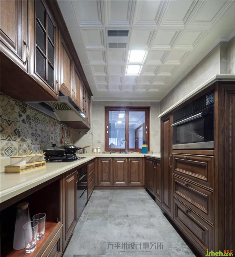 廚房U型櫥柜設(shè)計以最大利用空間,因中部通道尺寸并不十分寬敞,因此右側(cè)設(shè)置半高柜將電器嵌入式安裝,頂部留空保留兩側(cè)的空間感。