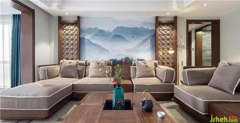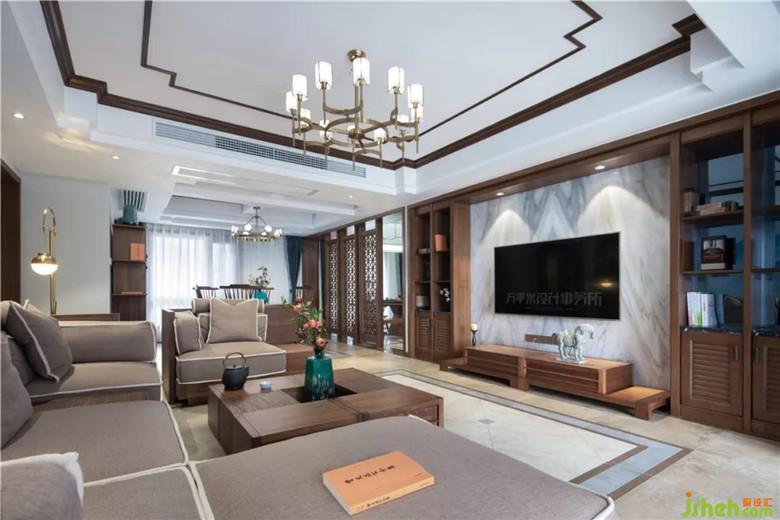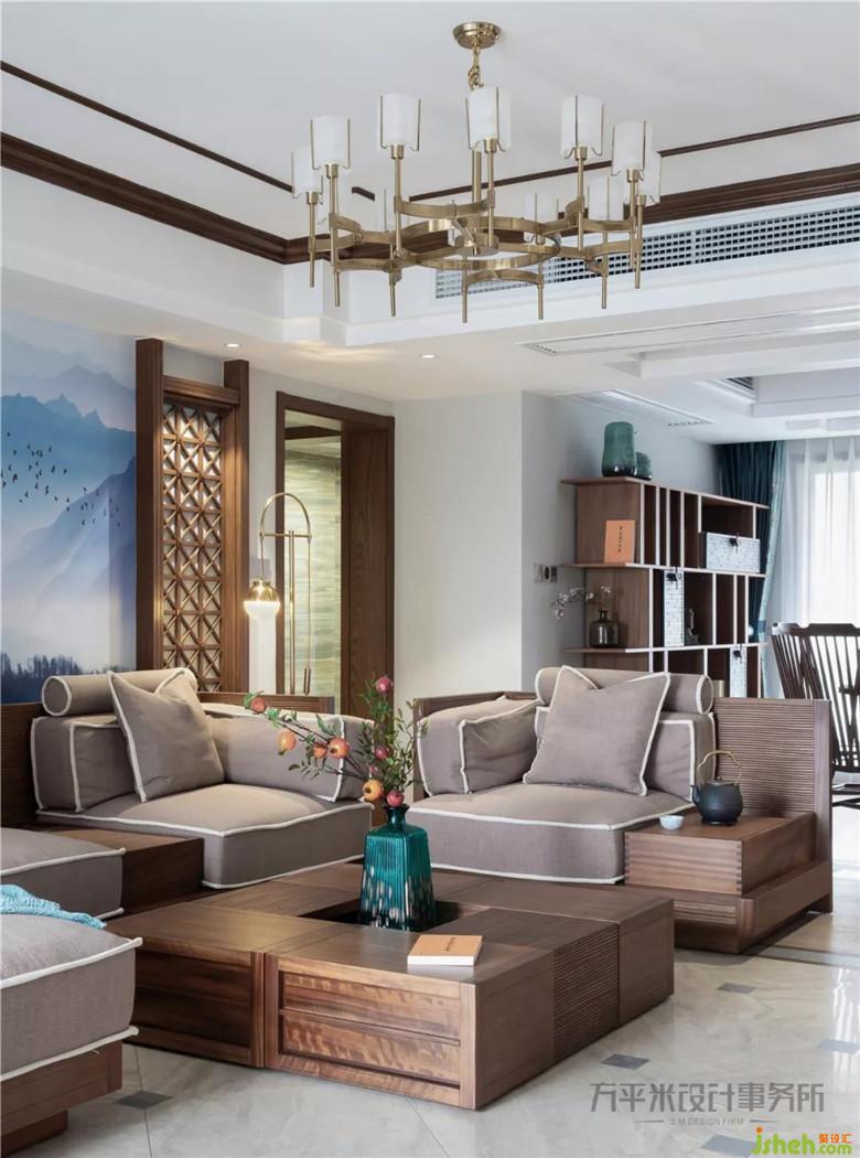 餐廳隔墻后移,使屏風(fēng)與電視背景處于同一水平,組成連續(xù)的統(tǒng)一裝飾立面。書房及客餐廳作為相鄰的起居會(huì)客區(qū)域更顯寬敞通透,富于交流。頂面造型取中式傳統(tǒng)流暢直紋,以漸進(jìn)層次的雙木色線條行走協(xié)調(diào)重心比例。地面灰藍(lán)色地磚波導(dǎo)拼花從硬裝呼應(yīng)軟裝用色。電視墻兩側(cè)展示收納柜以山紋天然大理石為底,將地柜嵌入式圍合內(nèi)收,通行無拘更具整體感。年輕感的新中式家具選擇,線條簡(jiǎn)潔。木與布藝的結(jié)合提升舒適感及功能實(shí)用性。柔軟觸感面增添居家溫馨氛圍。