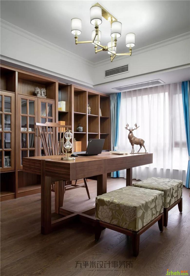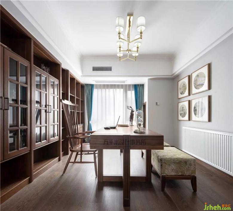 全銅燈具圓潤(rùn)造型打破平直方正線條的單一無趣,金屬特有光澤提升質(zhì)感,為傳統(tǒng)空間注入利落的現(xiàn)代元素。兩側(cè)定制屏風(fēng)呼應(yīng)于餐廳同款隔斷,于相鄰空間內(nèi)有相同元素呼應(yīng)。內(nèi)空采用灰藍(lán)色調(diào)山林遠(yuǎn)景墻布,利用景深使空間縱向延展。連綿群山起伏,層巒疊嶂,云深不知處,飛鳥蹤影躍然,寧靜卻生動(dòng)。將書房入口調(diào)整,縮短狹長(zhǎng)走廊,部分走廊空間被并入書房,面積得以擴(kuò)大。當(dāng)關(guān)閉書房房門時(shí),可將書房視作主臥套間內(nèi)部分使用,較為私密,當(dāng)僅關(guān)閉主臥房門時(shí),書房又變得相對(duì)獨(dú)立且開放。設(shè)置滿墻連續(xù)的三組書柜提供強(qiáng)大收納,上下開放式展示層板,使柜體處空間感予以保留。