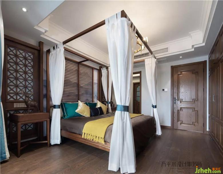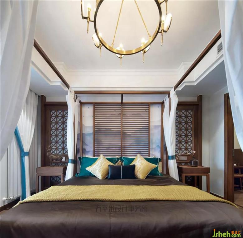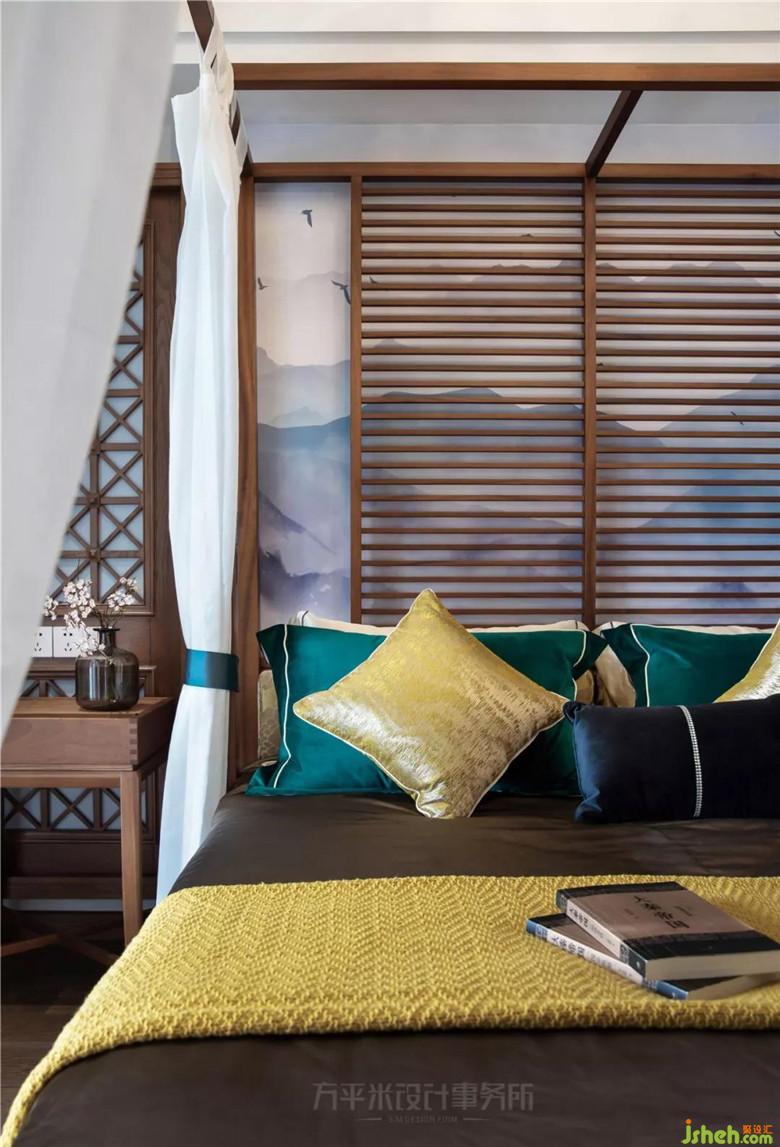 主臥床頭定制屏風(fēng)與灰藍(lán)墻布搭配呼應(yīng)于客廳處端莊氣質(zhì)?;宜{(lán)色調(diào)以溫潤(rùn)色彩打造出溫馨的入眠環(huán)境。兩側(cè)屏風(fēng)以考究比例將柱床圍鑲內(nèi)嵌。床尾滿墻嵌入式衣柜滿足日常收納。新中式簡(jiǎn)潔線條的勾勒強(qiáng)調(diào)木質(zhì)天然肌理。將東方韻味自然流露。沙金與墨綠的緞面床品以色彩彈活空間。